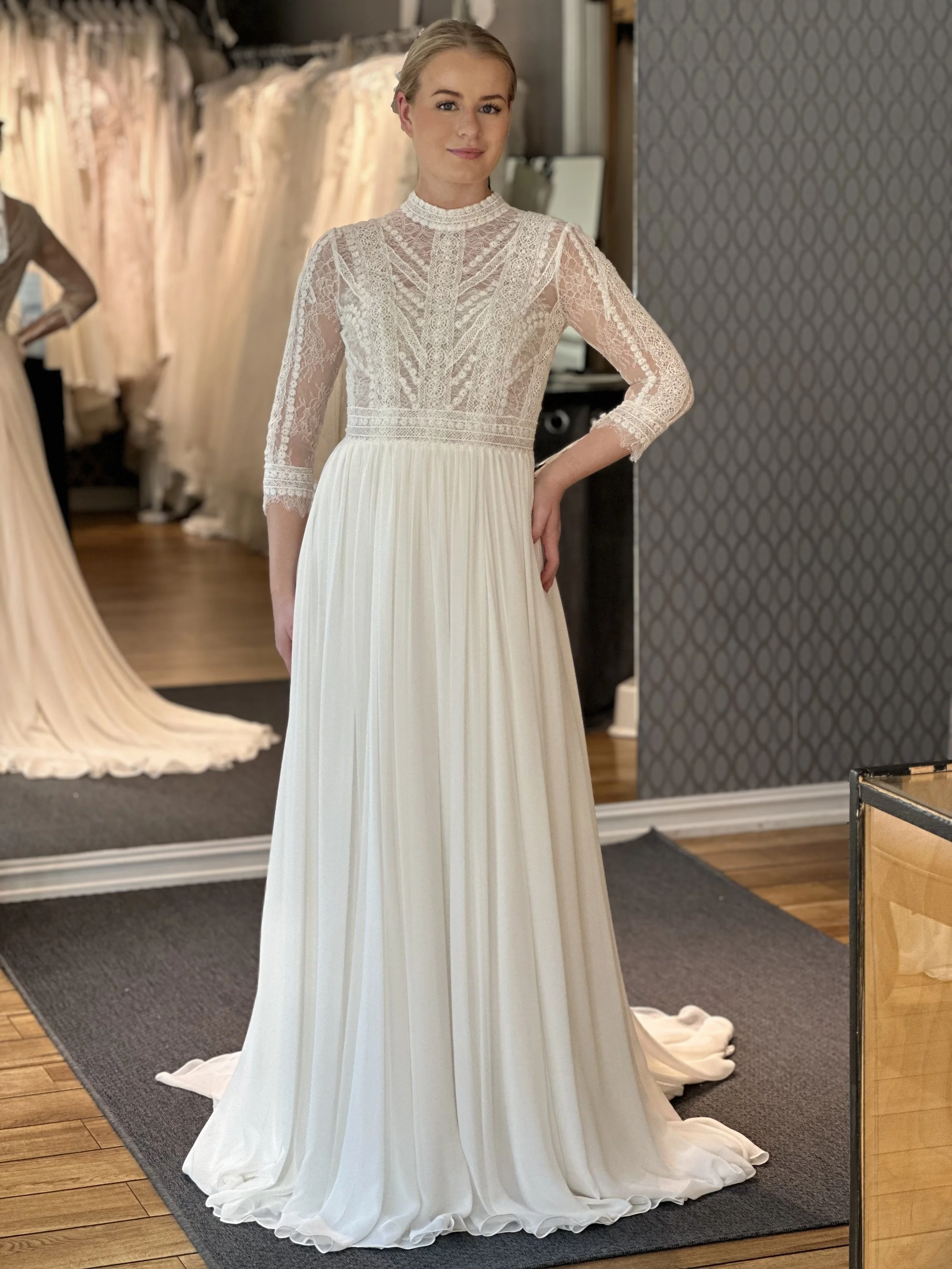 Nydelig ny brudekjole fra Ria Tener. "Silver" med høy hals, lange ermer og glitrende detaljer. Dette er en ny brudekjole og vi har den i str. 34.