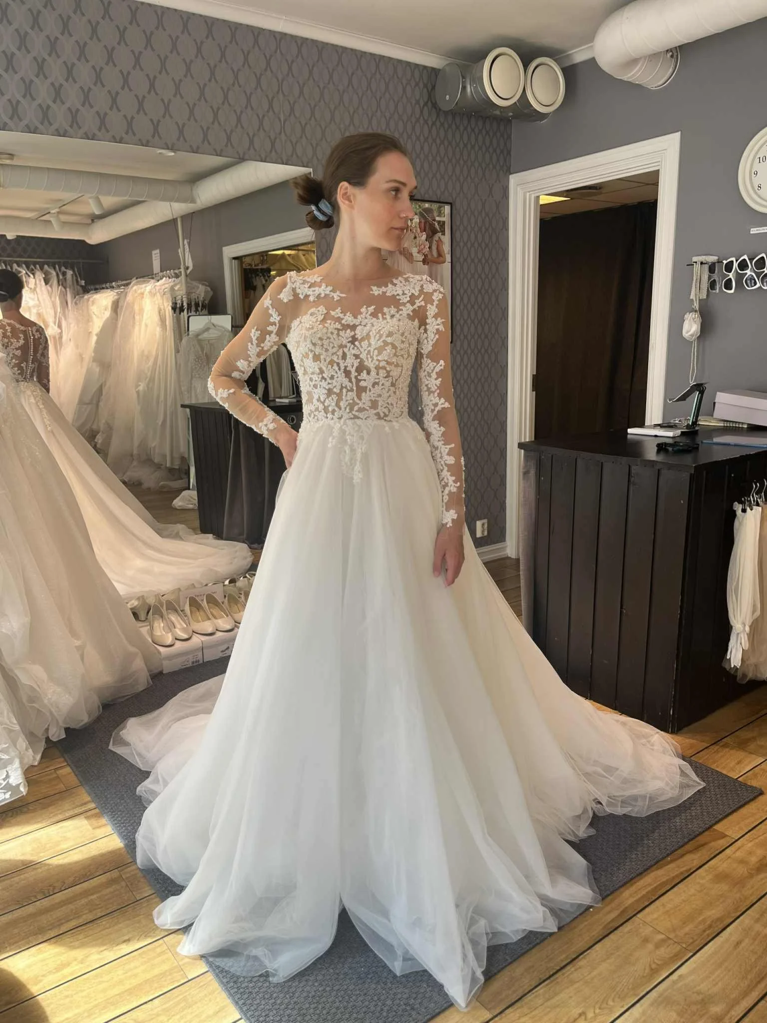 Smal brudekjole med lange ermer og dekket av vakre blonder. Den er dyp i ryggen. Denne er aldri brukt.