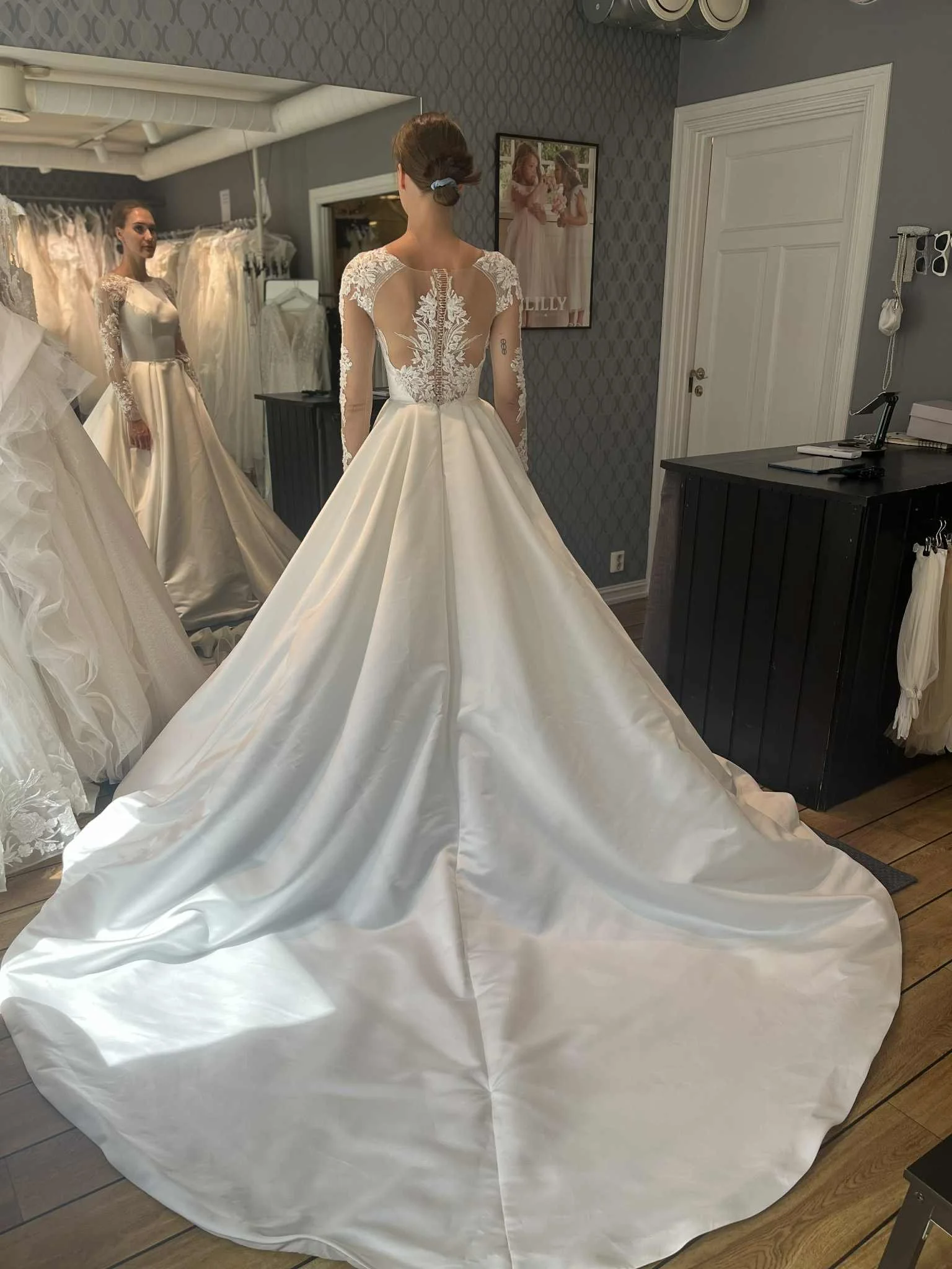Denne vakre brudekjolen har lange ermer og satengskjørt, og masse detaljer i overdelen. Den er meget smal i overdelen.