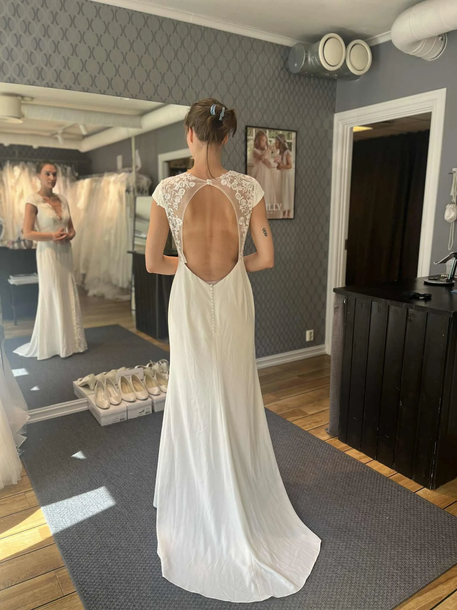 Enkel og elegant brudekjole med kort slep og åpen rygg. Perfekt som kjole 2.