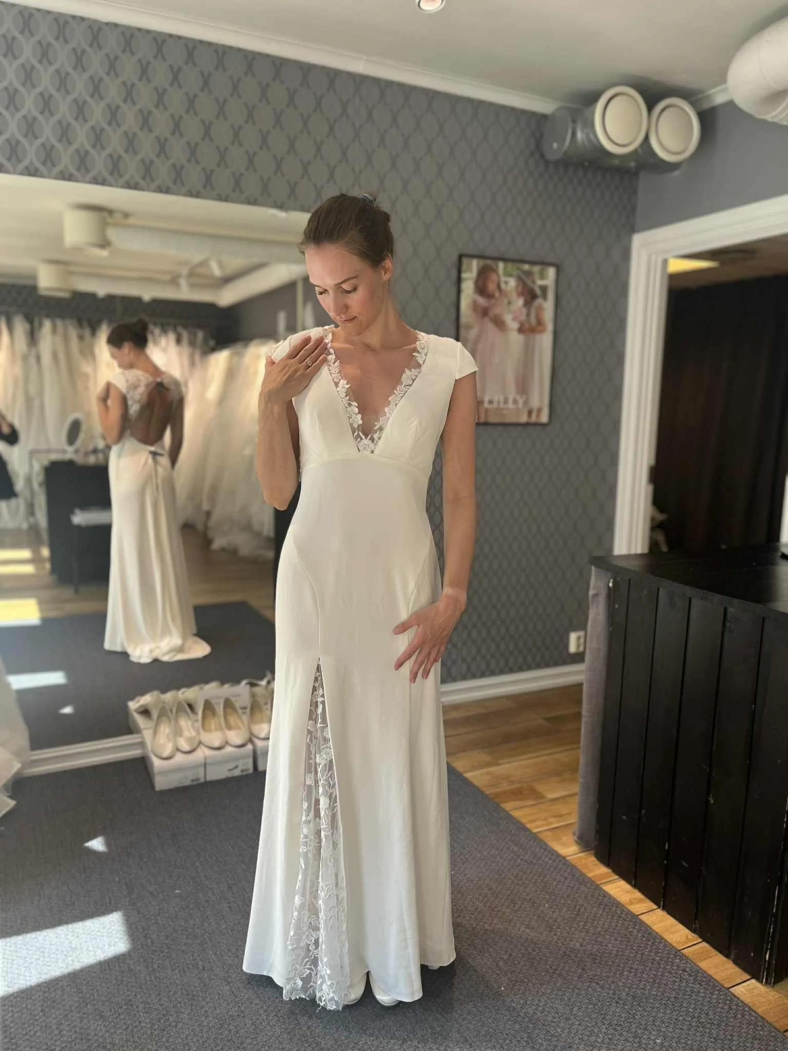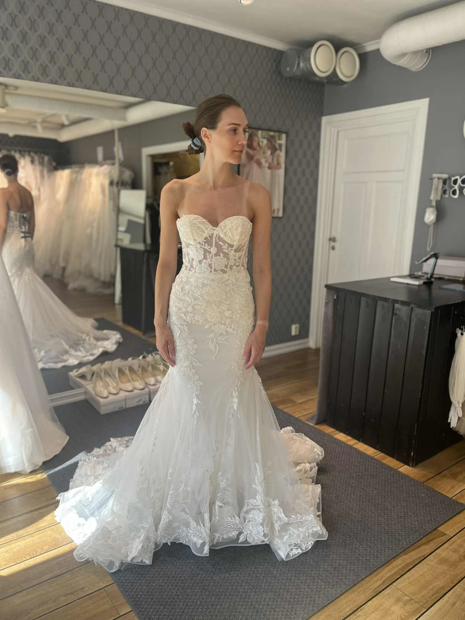 Ny brudekjole med avtagbar off-shoulder ermer. Vi tror den vil passe en 38 eller kanskje en 40.