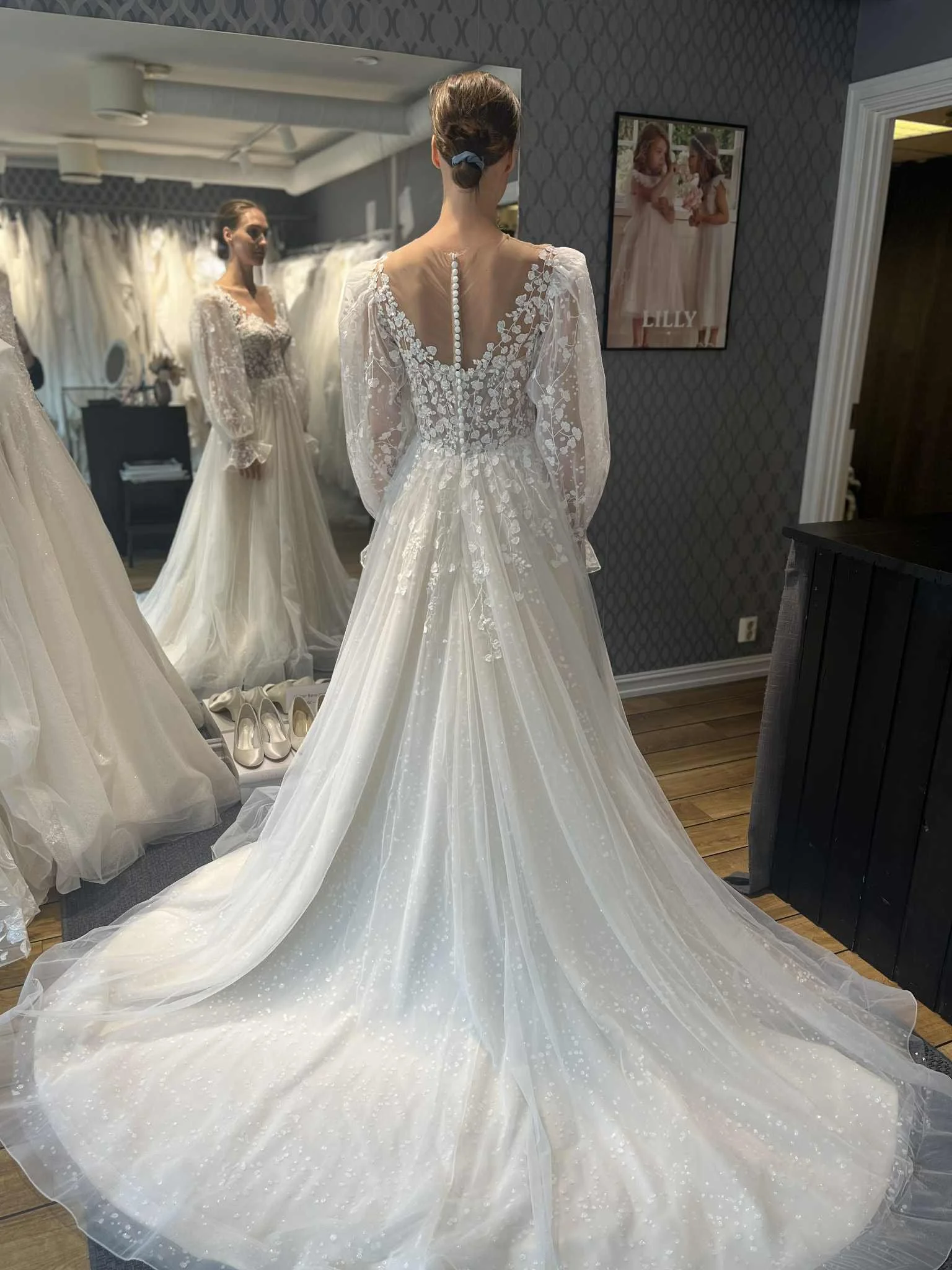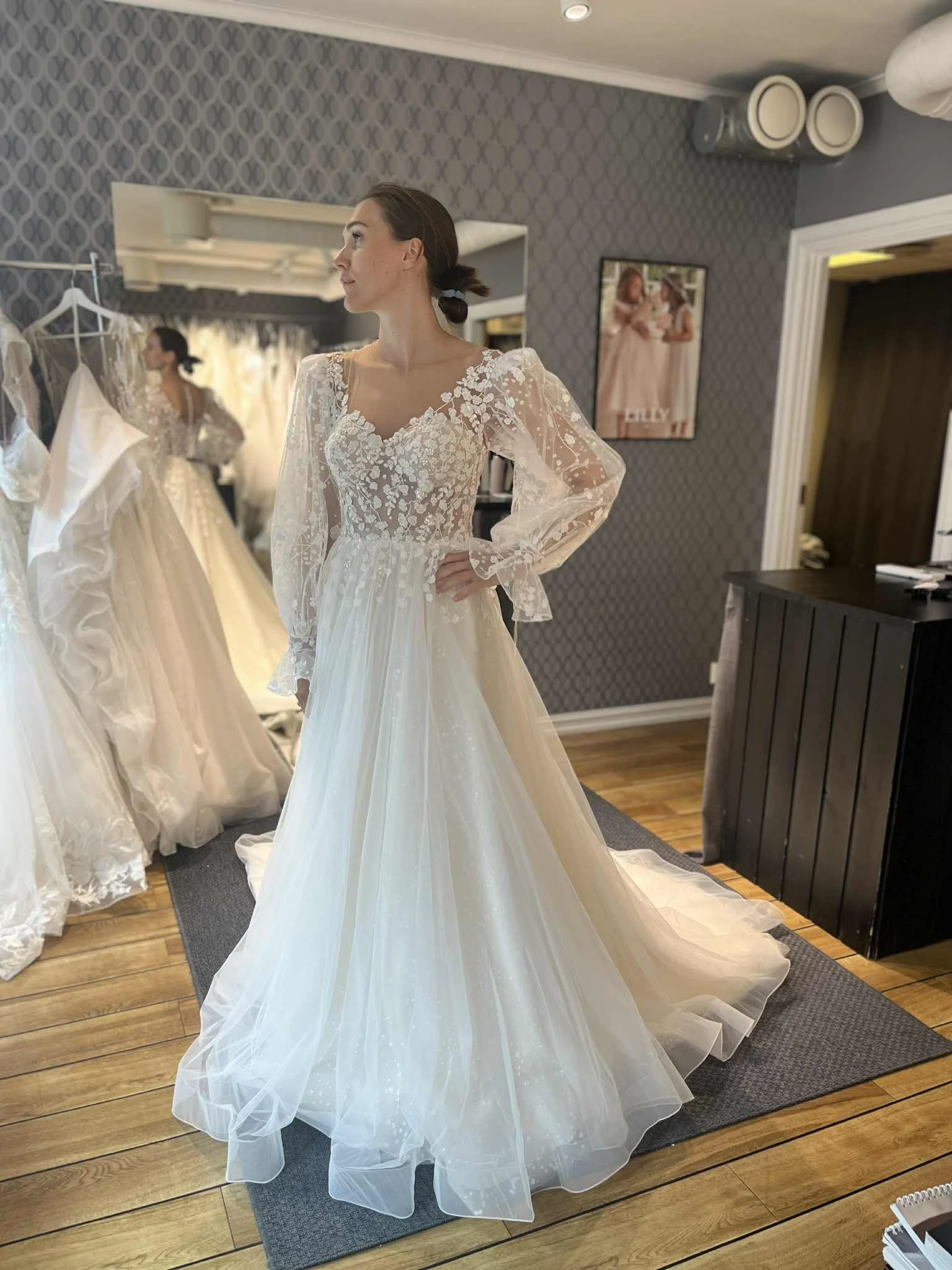 Denne vakre brudekjolen med lange ermer og nydelige blonder er fra Luce + Sposa og heter Chantilly. Dette er en av våre ubrukte brudekjoler