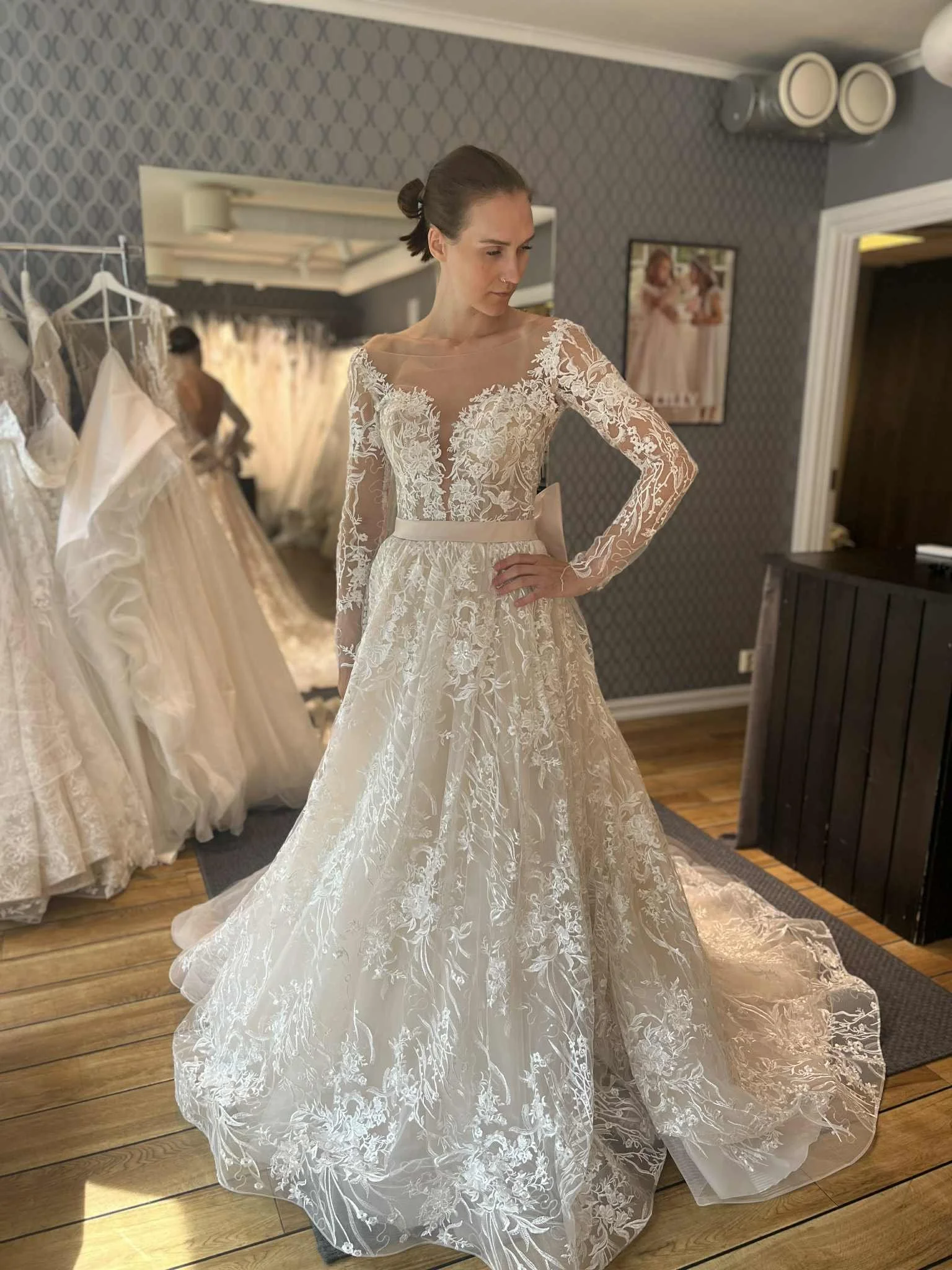 Juliana fra Bianco Evento er en av våre nye brudekjoler. Lange ermer, tett i ryggen, splitt. Sukk!