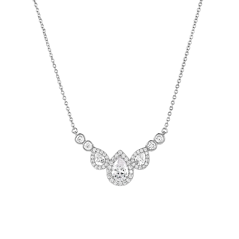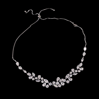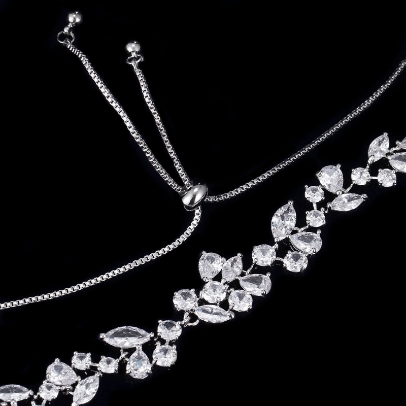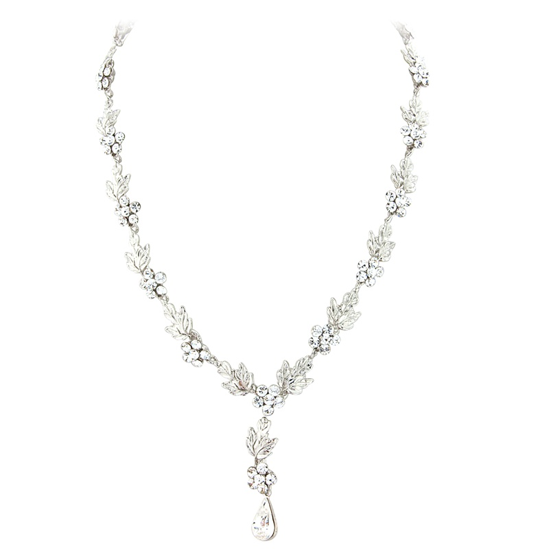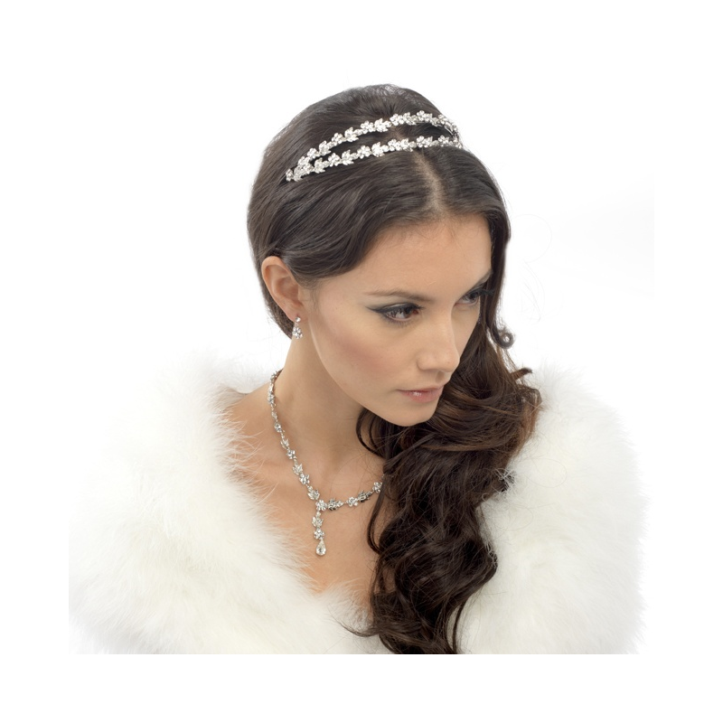 Smykkesettet består av et elegant halskjede og matchende øredobber, Dette settet har fokus på detaljer, og har krystaller av høy kvalitet som glitrer vakkert og tilfører brudekjolen det lille ekstra.